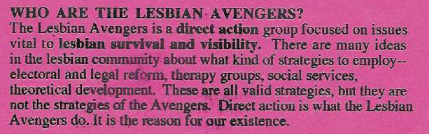 Here again, we see the foundations of a common pattern; lesbian get involved in gay and lesbian activism, feel they're being sidelined, and go off to create their own groups. A major source of inspiration for the Lesbian Avengers were the Radicalesbians, who had started as members of the Gay Liberation Front (GLF). As the future members of the Radicalesbians felt they were being exploited by the men they were working with in the GLF, Rita Mae Brown felt she had to do something to make space for lesbians, separate from gay men.