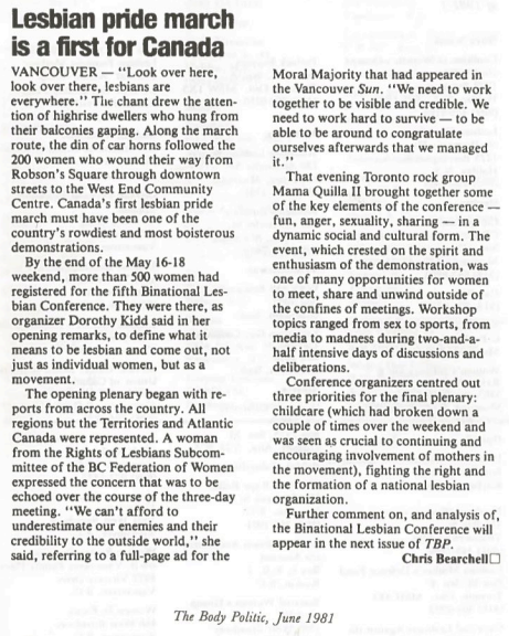 Before the idea of formal Dyke Marches came into existence, lesbians already had, and followed through on, the impulse to be visible on our own terms. On May 16th, 1981, a significant number of lesbians were in Vancouver to attend the Bi-Annual Lesbian Conference. About 200 lesbians started an impromptu march, infamously chanting, "Look over here, look over there, lesbians are everywhere!"