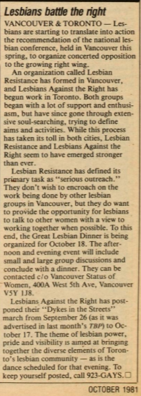 A few months later, in October 1981, a similar march took place in Toronto, but this one was more intentionally organized by the Lesbians Against the Right (LAR). This march was called "Dykes in the Streets" and had an attendance of about 350. Originally the members of LAR were simply part of Gays and Lesbians Against the Right Everywhere (GLARE). But as was common for gay and lesbian organizing of that era, when lesbian feminists took a stand about how the actions of any given organization were not in line with their feminist principles, they split off. In this case, the lesbians in GLARE did not want to platform drag, and after they split off, they could act in accordance with their lesbian feminist politics.